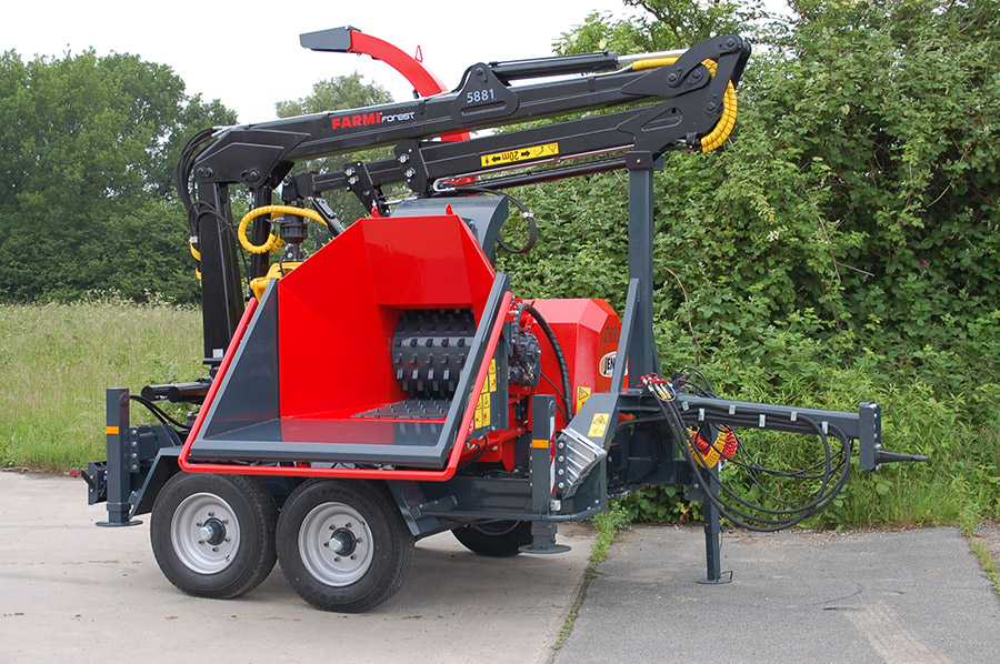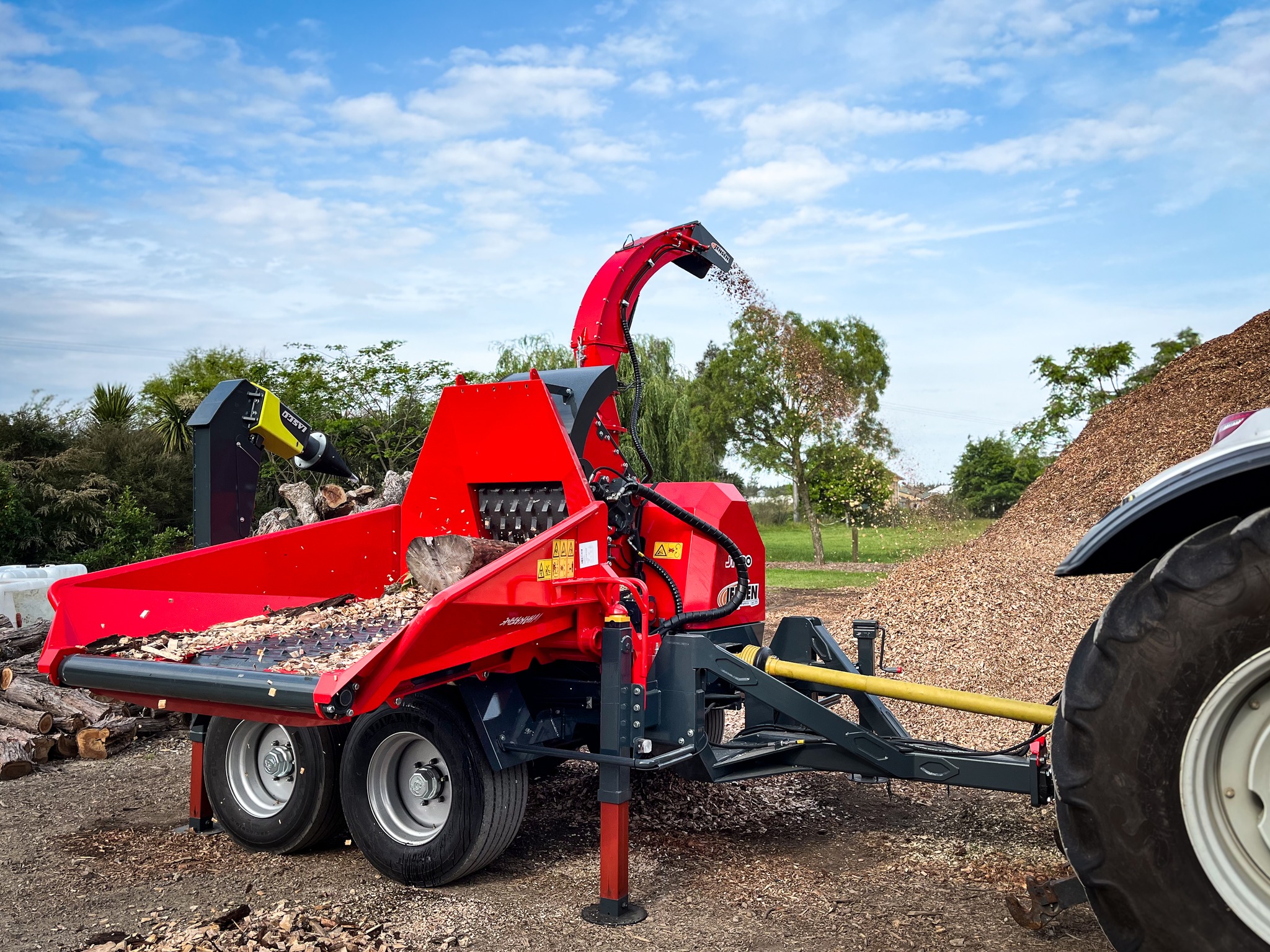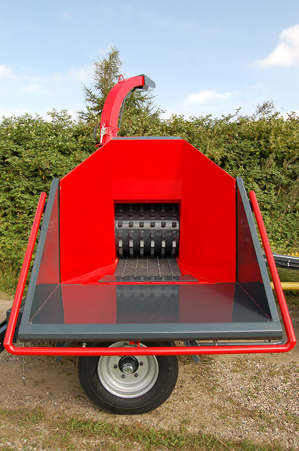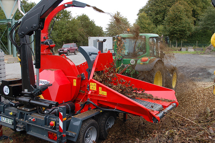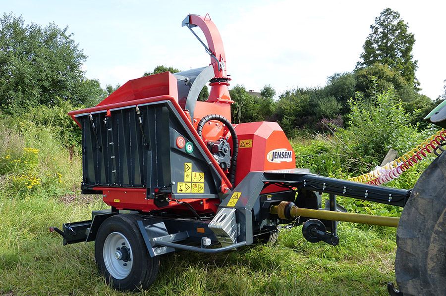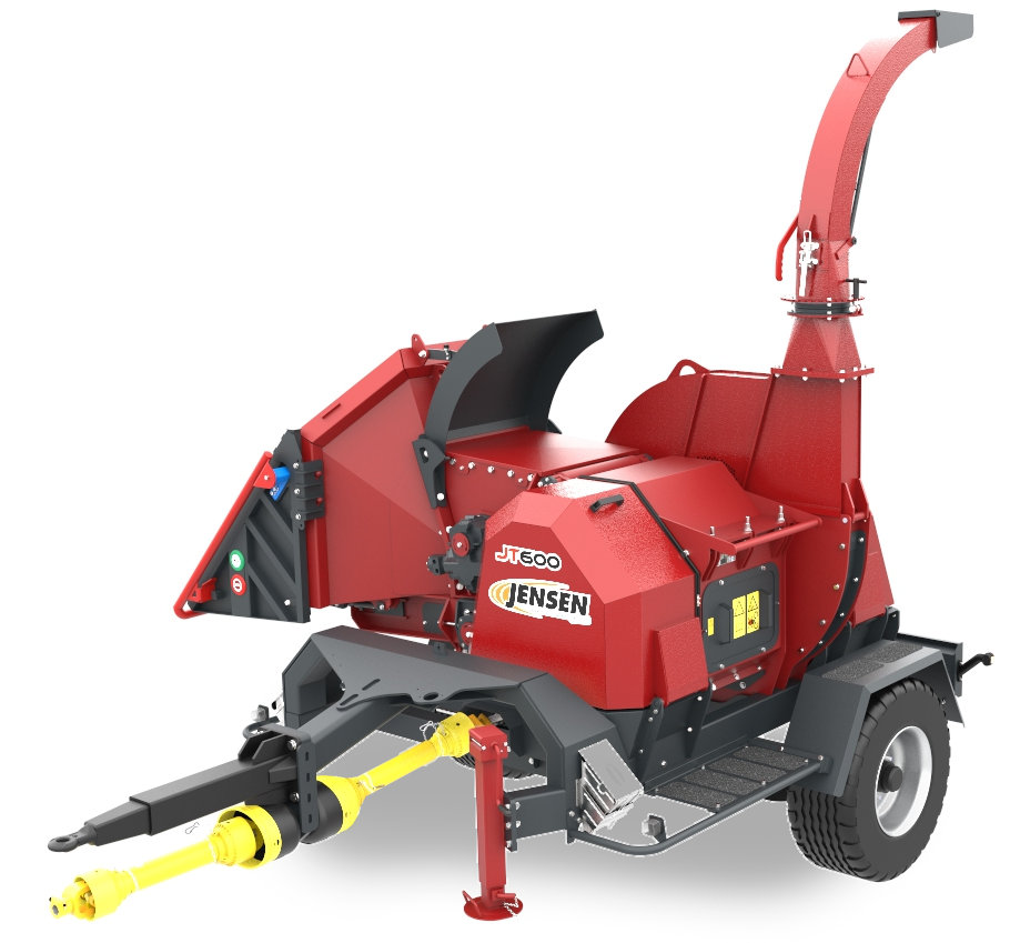 A JENSEN JT 600 professzionális, traktor TLT-meghajtású dobos aprítógép, amely 400 mm átmérőjű faanyag feldolgozására képes, nagy teljesítményt és megbízható munkavégzést biztosítva az ipari felhasználás számára.